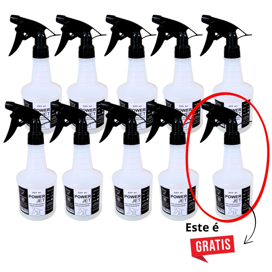 Kit com 10 Pulverizadores Power Jet 500ml. Compre 9 e leve 10. Jato de até 5m, gatilho preto reforçado e frasco em PEAD resistente. Ideal para limpeza profissional, indústrias e cozinhas industriais.