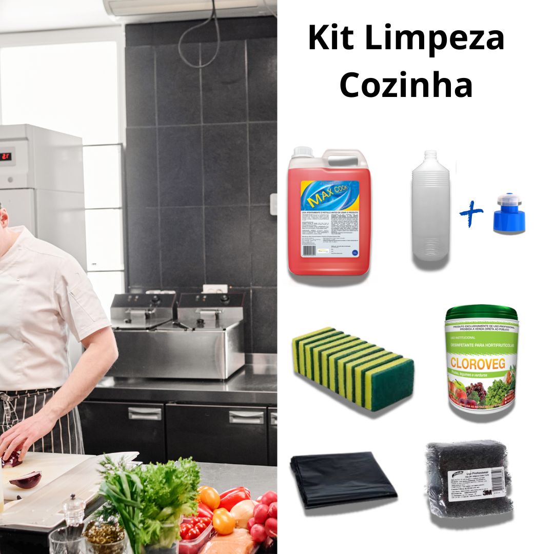 Kit Limpeza Cozinha: Inclui detergente Max-Cook 5L, sanitizante Cloroveg 1kg, 10 esponjas dupla face, frasco 1L push-pull, 5 fibras ultra pesadas 3M e 5 sacos de lixo 60L. Garanta limpeza impecável com praticidade!