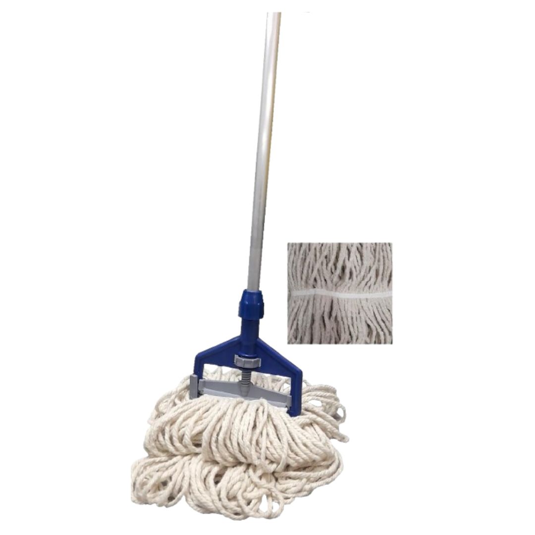Mop úmido completo com cabo de alumínio 1,40m, garra euro e refil 100% algodão com cinta. Alta absorção, resistente e ideal para limpeza pesada em pisos.