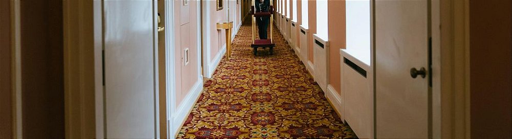 Hotéis: corredores, quartos com carpete, tapetes decorativos;